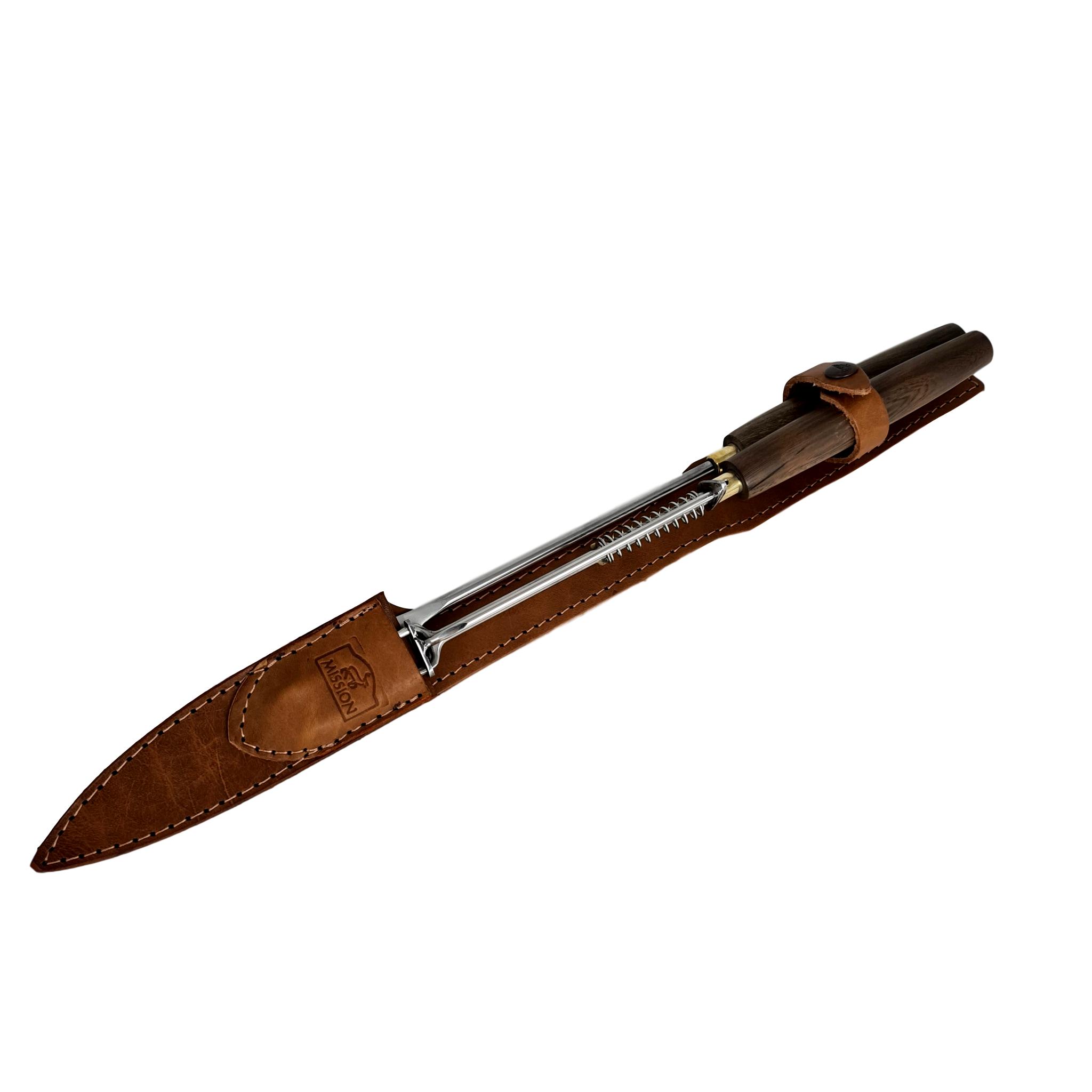 Cuchillos fabricados en Argentina. Acero inoxidable, al agua, 420 molibdeno vanadio español, de una dureza similar al acero 440 o quirúrgico, pero con la ductilidad de ser afilado con chaira o piedra. Encabados en madera Guayubira o Asta de ciervo de volteo. Templado, revenido, pulido y afilado de manera artesanal. Las vainas de cuero diseñadas especialmente para cada modelo con protección de costuras en el filo.