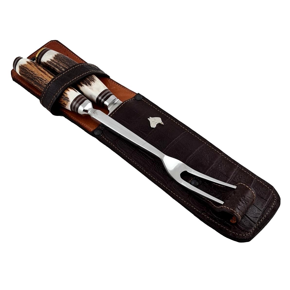 Cuchillo y tenedor de trinchar SEIGEN® Encabado Artesanal en asta de ciervo de volteo Las hojas de cuchillo SEIGEN® son alemanas de acero inoxidable 440 (es un acero de alta resistencia y dureza , con una alta resistencia a la corrosión , es excelente para el uso diario) Los tenedores SEIGEN® Inox 440 fueron diseñados fuertes y prácticos para armonizar con las hojas SEIGEN® Inox 440 en términos de calidad y estilo discreto. Al ser un trabajo artesanal ninguna pieza es igual a otra tanto en el color y la forma de la madera, asta o como en el repujado de la alpaca si los tuviere. La imagen es ilustrativa.