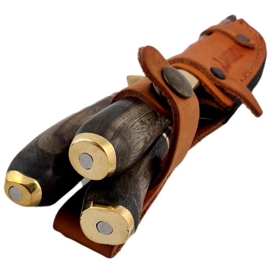 Cuchillos fabricados en Argentina. Acero inoxidable, al agua, 420 molibdeno vanadio español, de una dureza similar al acero 440 o quirúrgico, pero con la ductilidad de ser afilado con chaira o piedra. Encabados en madera Guayubira o Asta de ciervo de volteo. Templado, revenido, pulido y afilado de manera artesanal. Las vainas de cuero diseñadas especialmente para cada modelo con protección de costuras en el filo. Foto a modo ilustrativo. Al ser productos naturales, como la madera, y producidos artesanalmente pueden presentar leves diferencias visuales respecto de la de foto. Como por ejemplo diferente tono o patron del mango.