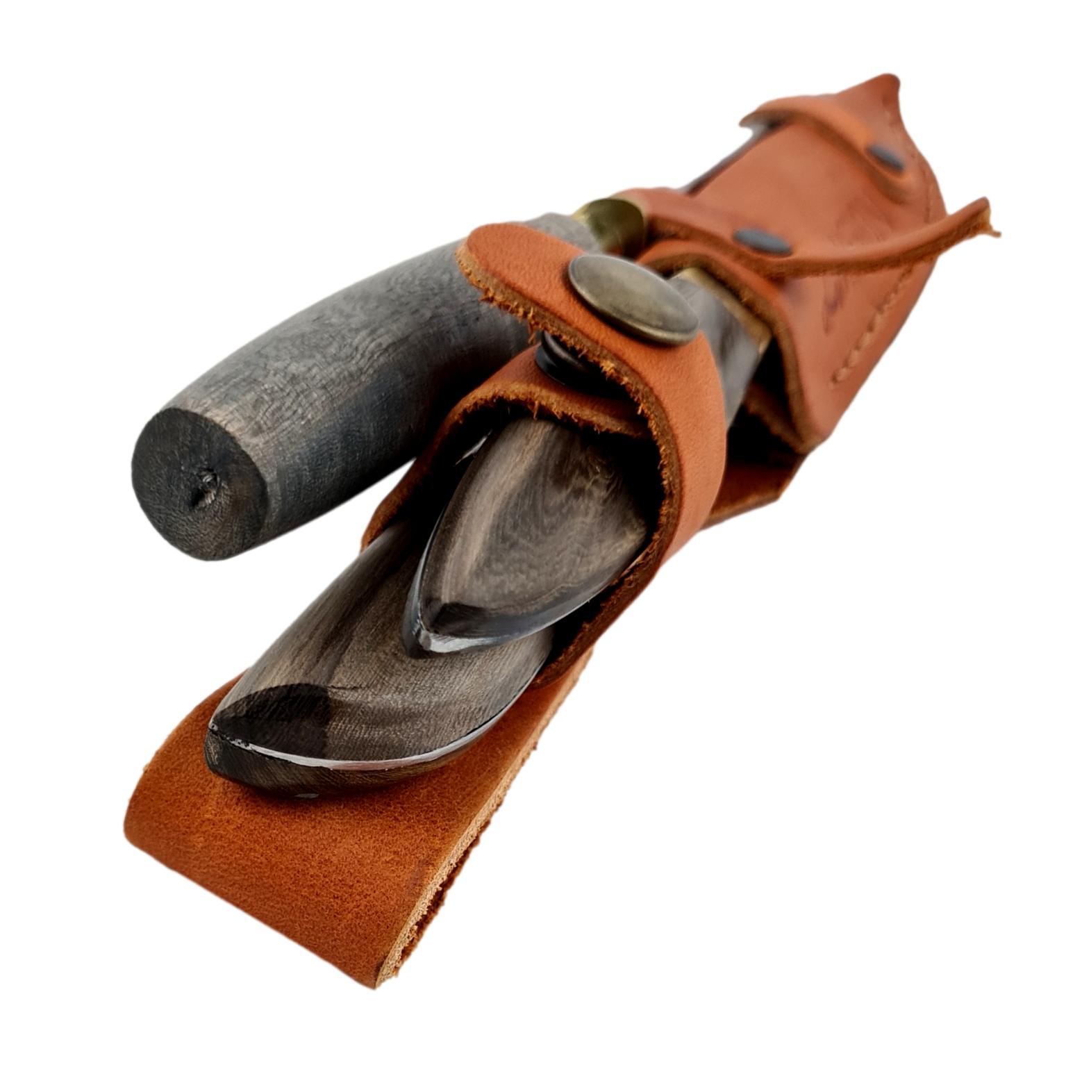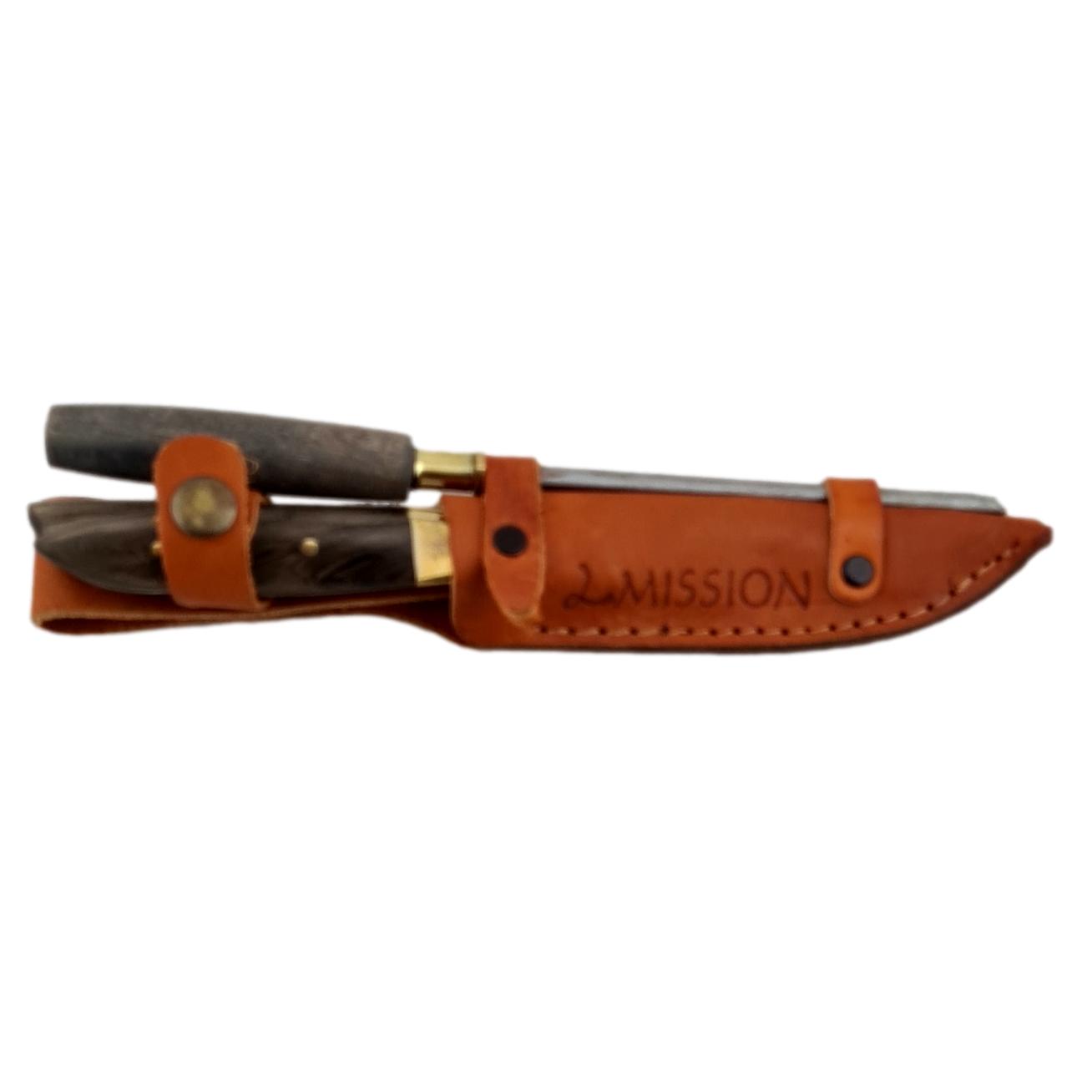 Cuchillos fabricados en Argentina. Acero inoxidable, al agua, 420 molibdeno vanadio español, de una dureza similar al acero 440 o quirúrgico, pero con la ductilidad de ser afilado con chaira o piedra. Encabados en madera Guayubira o Asta de ciervo de volteo. Templado, revenido, pulido y afilado de manera artesanal. Las vainas de cuero diseñadas especialmente para cada modelo con protección de costuras en el filo. Foto a modo ilustrativo. Al ser productos naturales, como la madera, y producidos artesanalmente pueden presentar leves diferencias visuales respecto de la de foto. Como por ejemplo diferente tono o patron del mango.
